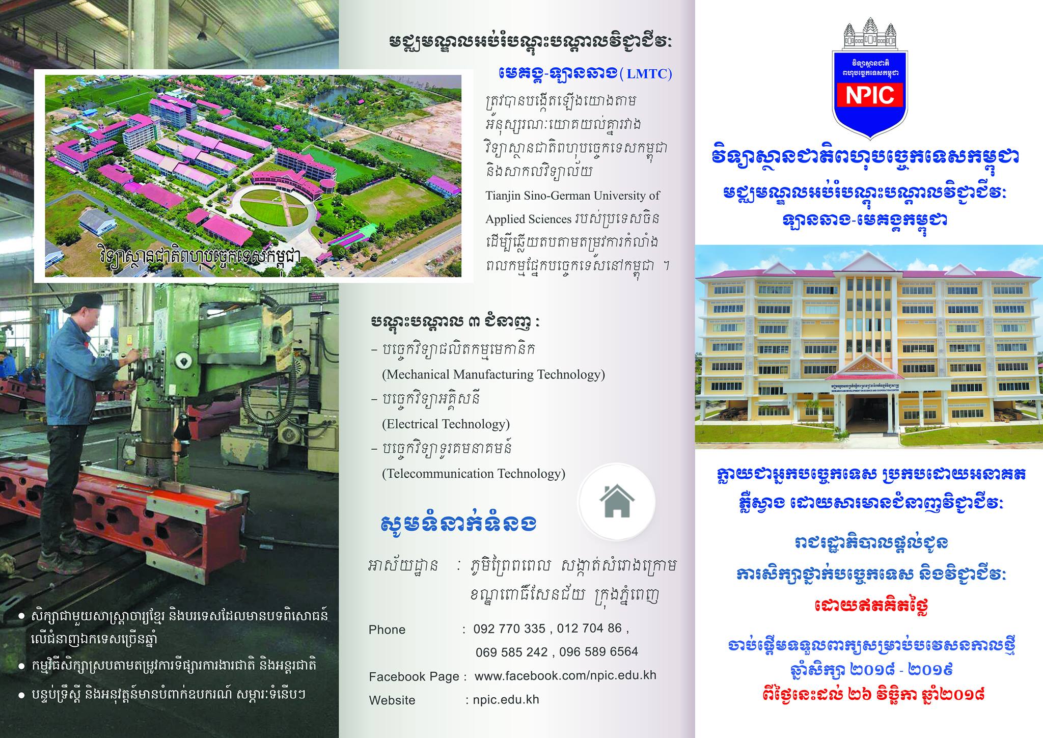 ក. មេកានិក សិក្សាពីមូលដ្ឋានគ្រឹះនៃការងារប្រមុំ(Fitting Metal) ម៉ាស៊ីនក្រឡឹង ហ្វ្រែ ម៉ាស៊ីនស័្វយប្រវត្តិCNC និងម៉ាស៊ីនចង្វាក់ផលិតកម្មស្វ័យប្រវត្តិ(Automation Production Line) និង ប្រព័ន្ធខ្យល់&ប្រព័ន្ធប្រេង